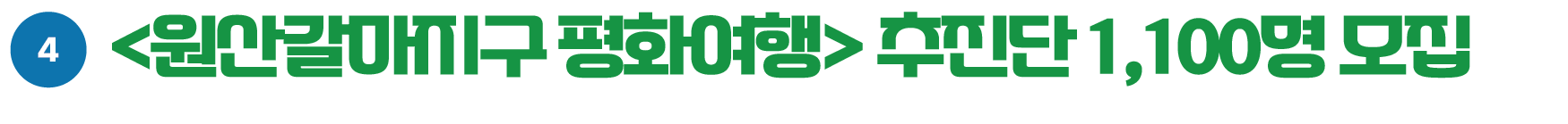 시민의 힘으로 원산갈마지구의 평화 여정을 열어가기 위해 ‘원산갈마지구 평화여행 추진단’ 1,100명 모집을 시작했습니다. 이 여정은 평화와 연결의 새로운 길을 시민이 직접 만들어가는 과정이 될 것 입니다. 10월부터 단계적으로 다음과 같은 걸음을 내딛습니다.