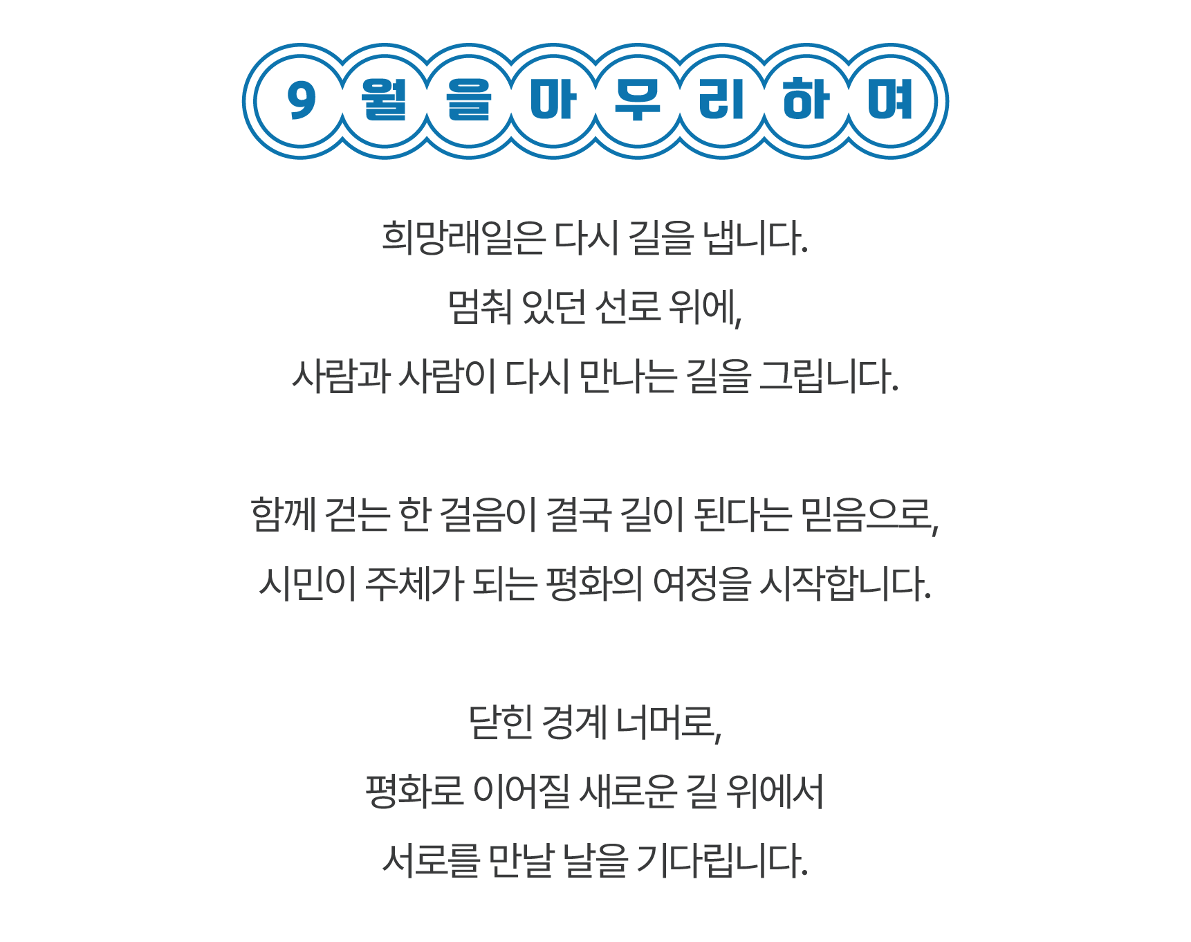 여러분의 참여와 응원이 모여 서울에서 원산으로, 그리고 대륙으로 이어지는 새로운 평화의 노선을 만들어갑니다. 함께 걸어주셔서 고맙습니다.