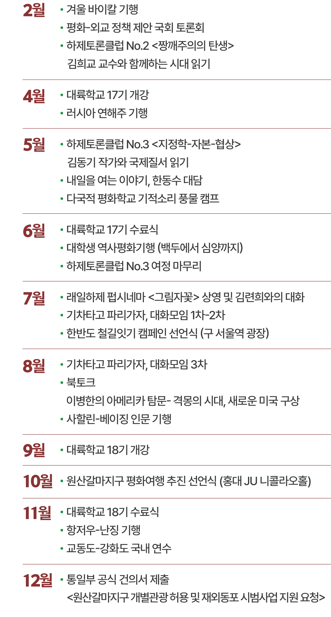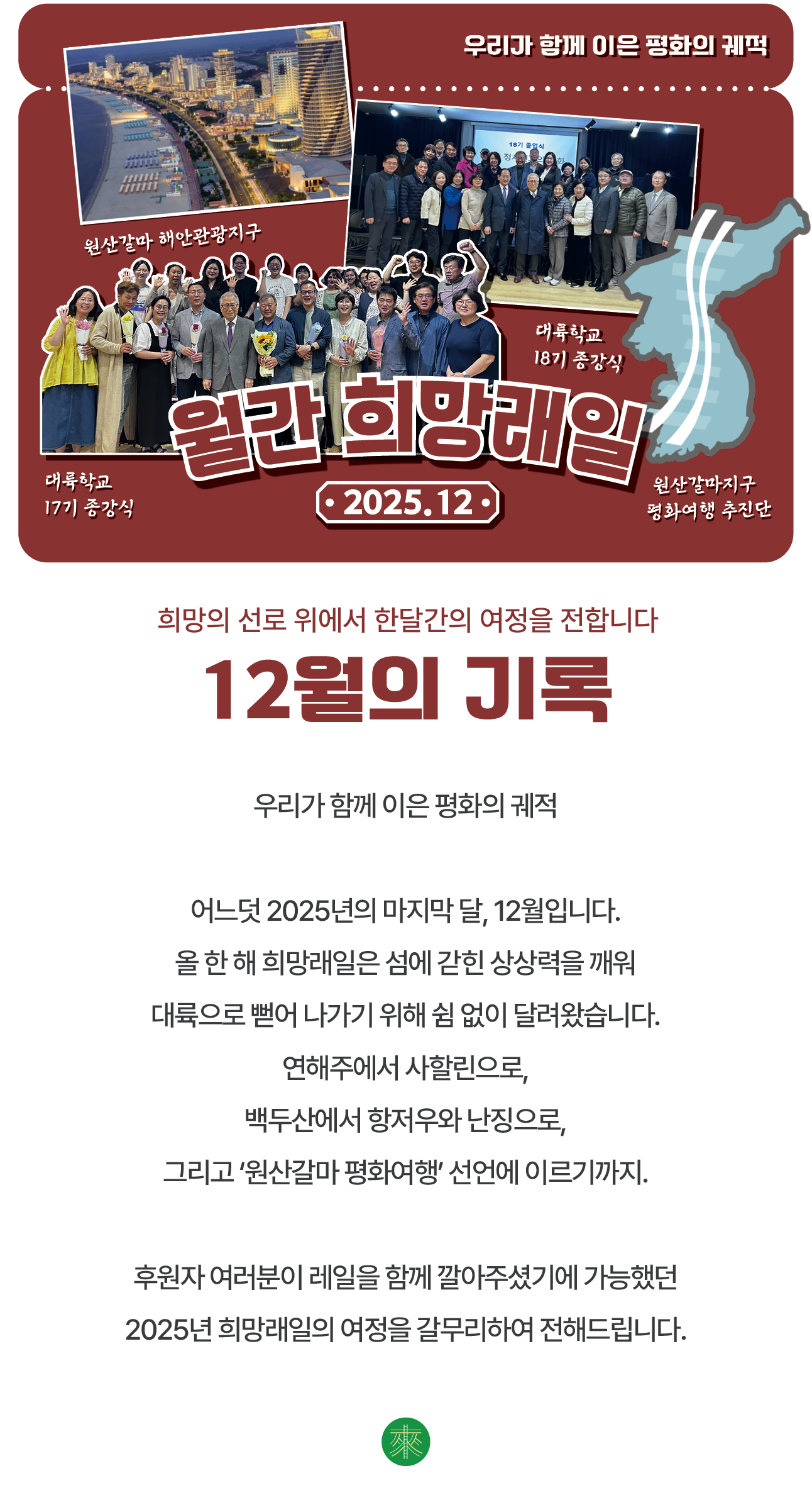 <원산갈마 평화여행>을 위해 통일부 건의서 제출 이후의 실질적인 대화를 이어가고, 해외 동포 시범관광을 통해 우리가 꿈꾸는 평화여행의 구체적인 모델을 준비하겠습니다. 전국 순회 설명회에서 여러분의 목소리를 듣고, 도라산행 특별열차 안에서 함께 평화의 기적소리를 듣겠습니다.